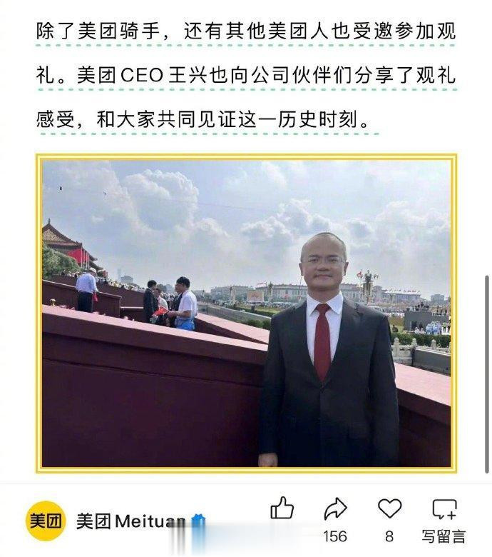 但王兴只是单纯的现身,当天的美团官方发文也颇为低调,只po出了一张王兴的单人照,更多的版面给了参加仪式的美团骑手。